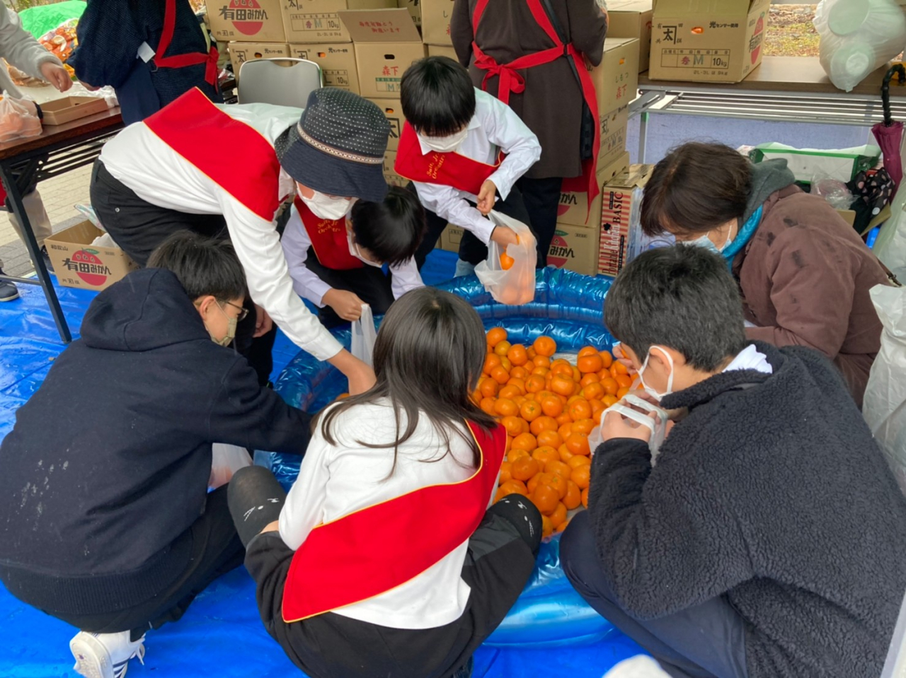 母子会祭りゆえに、屋外のイベントでみかん詰め放題に挑戦。焼きそばもいただきました!
