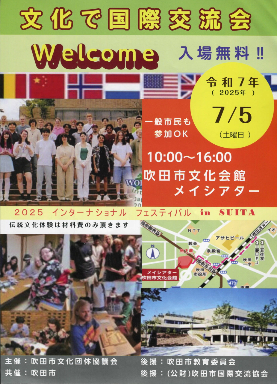 2025年7月5日(土)09:50~11:30 メイシアター・Suita×Art(すいたあと)にて 文化で国際交流会に出演させていただきます。