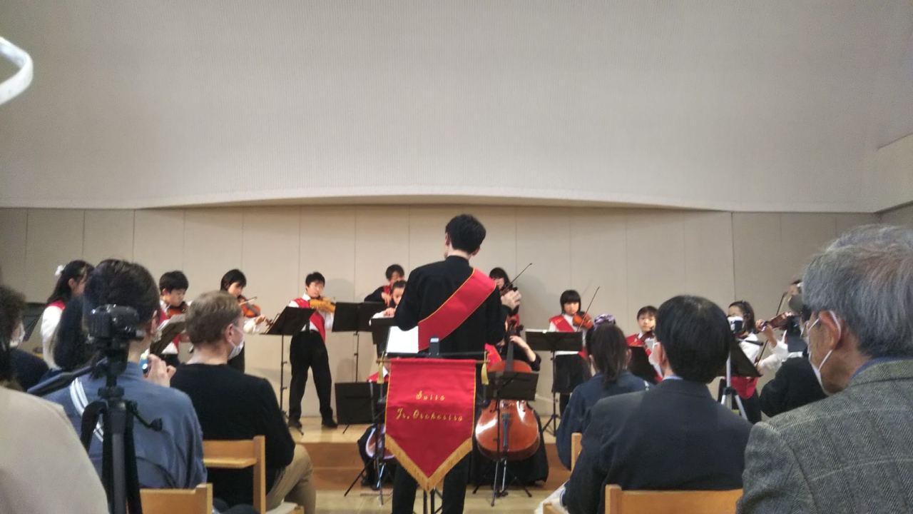 1日のうち場所を変えて2公演となれば、かなりハードなスケジュール。朝10時過ぎにメイシアターに集合してリハーサルを行い、12時からのコンサートではその日ホールの前広場でほかのイベントがあり、往来激しくお互いの音を聴くのも難しい中、阪さんの指揮を見ながらみんなよく弾きました。特に、プレジュニアの子どもたちは単独で演奏するのはこの日が初めて!2学期まではジュニアのお兄ちゃんや大人も一緒に弾いたり休みの小節を数えたりしましたが、3学期からは彼・彼女らだけでの演奏を何度か練習しました。最初は、生まれたての子鹿が足をガタガタ震わせ、膝から落ちるような演奏(実際に落ちた!)でハラハラしながら我慢して見守っていましたが、この日見事に自力で立ち上がって跳んでいました。もう大丈夫!楽章を抜粋して弾いた小学生クラスのモーツァルトも中高生クラスのブリテンも、メイシアターでは3回目とあって慣れたものでした。全体曲の葉加瀬太郎:Home Suita Homeでは、この演奏会で退団する二人がダブルソリで見事に弾いてくれ、安心して聴くこともできました。